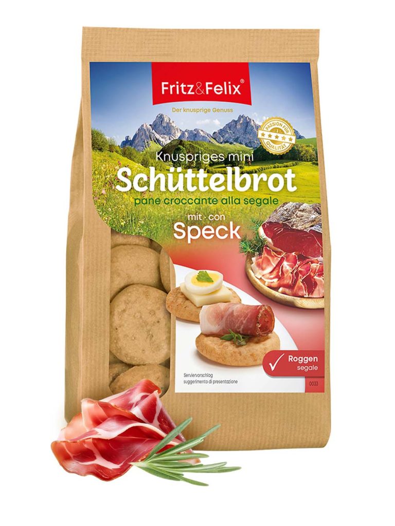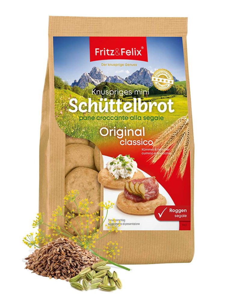 125 g We’ve created something truly special for the Mini Schüttelbrot Speck: in the traditional South Tyrolean snack, Schüttelbrot is usually enjoyed alongside this cured meat. With our product, however, thinly sliced speck is already incorporated inside the Schüttelbrot. Lactose-free 90% rye flour unique taste experience with pieces of speck a delicious South Tyrolean snack […]